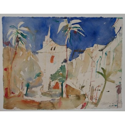 Ramon Canet, 69 x 48 cm, litografía. Se trata de una obra abstracta fruto de las influencias que recibió el artista, dando lugar a obras como ésta en la que el resultado final es fruto del azar y la renuncia de la premeditación de la obra. Se aprecian rasgos que caracterizan la obra de Canet como el cromatismo vibrante, en esta litografía el artista utiliza una paleta de colores contrastados a raíz de tonalidades cálidas como el naranja frente a tonalidades frías como son el azul, negro y verde. Desde el punto de vista técnico, se aprecian rasgos formales procedentes de dichos movimientos, como son los actos gestuales tales como las salpicaduras, el goteo y la multidireccionalidad del trazo de la pincelada en las masas de color negro.