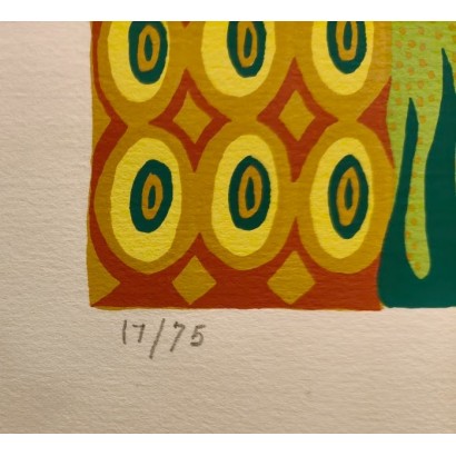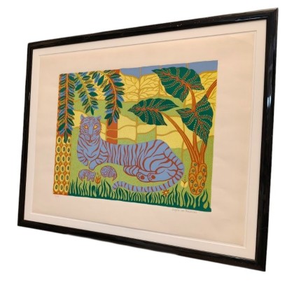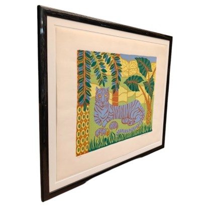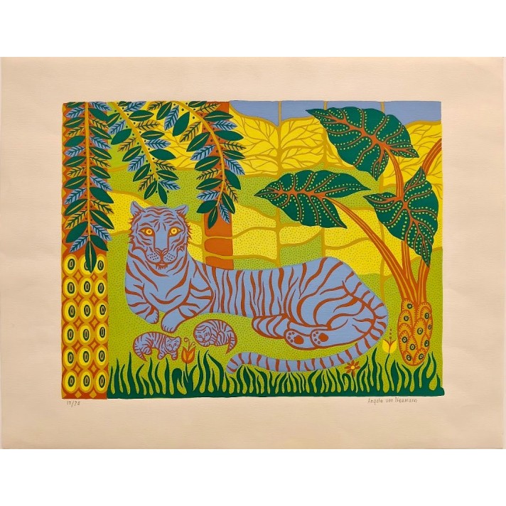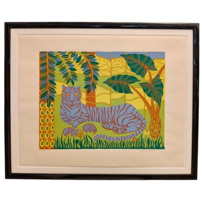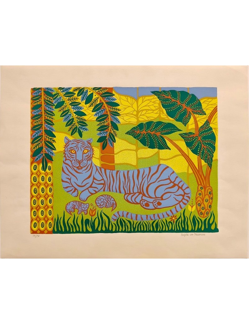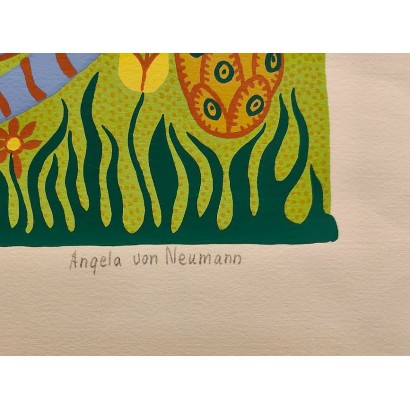El surrealismo y la psicodelia, junto al acercamiento al naif y al puntillismo, llega en la década de los 60 y nos permite descubrir en su obra el lenguaje tan universal como propio y único con el que quiere comunicarse; con mensajes de gran carga emocional y sentimental, que transmiten cierta inquietud, pero a la vez optimismo vital. Ángela Von Neumann expondrá en la galería Pelaires, por aquel entonces, junto a un artista catalán ya muy reconocida su obra entonces, Joan Miró. La litografía "Tigre" recoge la escelencia de toda la obra de Ángela y es una oportunidad única. Se encuentra en perfecto estado de conservación.