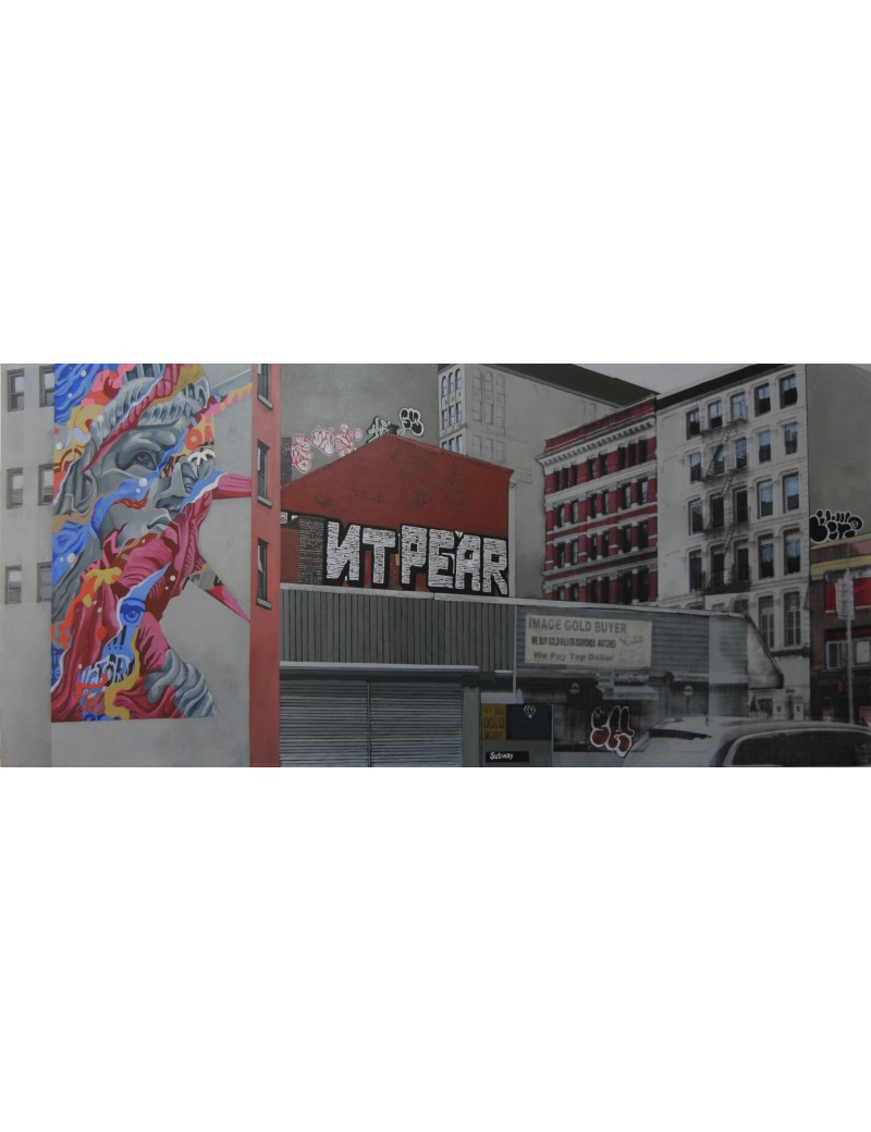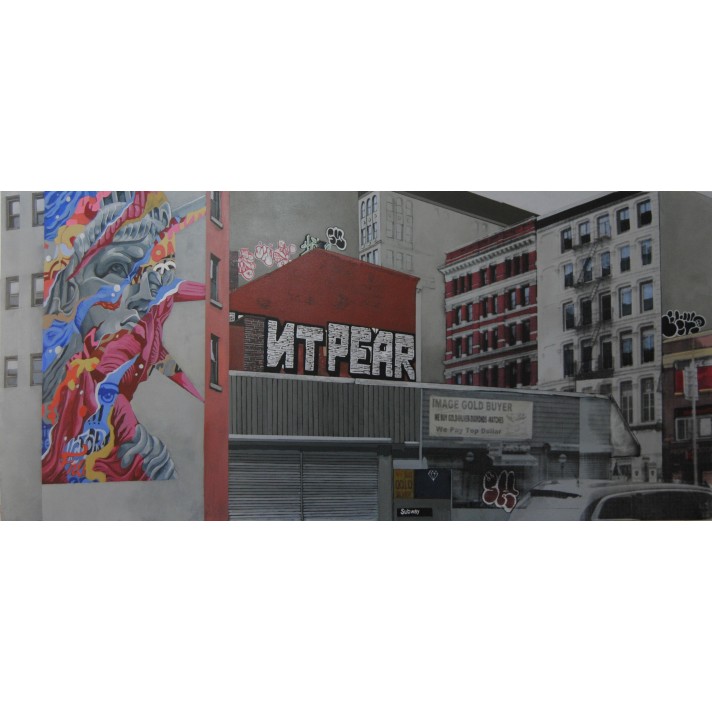 José Juan Gimeno, 70 x 150 cm, acrílico y metacrilato. Esta obra representa la ciudad de Nueva York desde distintos ángulos y planos. Por un lado, a la derecha, vemos los edificios característicos, con ventanas altas y escaleras de emergencia en la misma fachada, que contrastan con los colores más vivos de algunos pequeños graffitis. Predominan los grises y los granates, reflejando el color de los ladrillos rojizos. El toque de color del cuadro lo da una obra de arte urbano que representa la Estatua de la Libertad en un estilo pop.