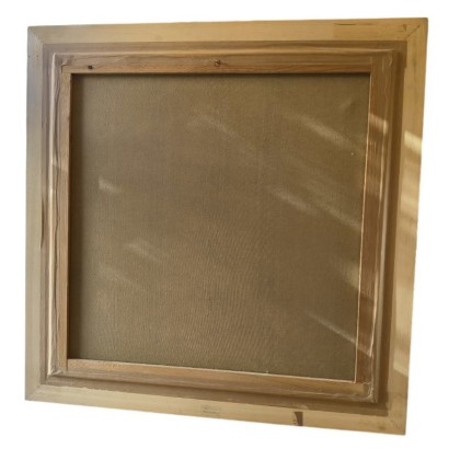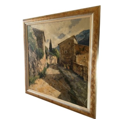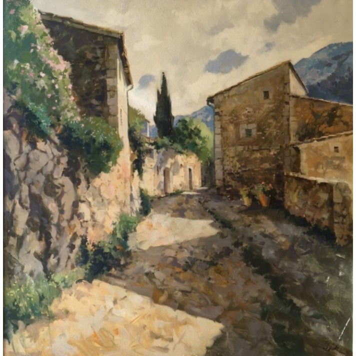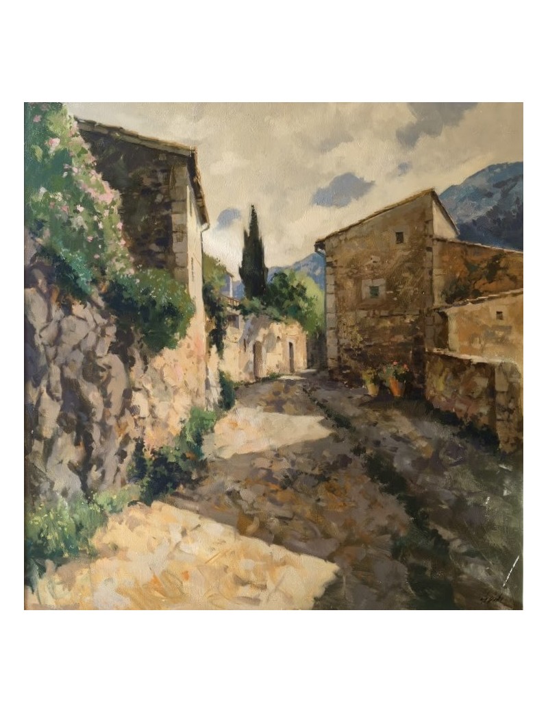 Pascual de Cabo, 100 x 100 cm, óleo sobre tela. Vista de la calle del pueblo de Orient en la Serra de Tramuntana. El cuadro centra la calle en la composición, dejando a cada lado, las fachadas de las consecutivas viviendas con sus portales y patios centenarios de piedra. Con la vegetación y las montañas de fondo, se antoja un paraje bucólico. Las fachadas bañadas por la luz del sol, en contraste con las fachadas en sombra, producen un gran efecto lumínico.