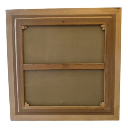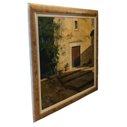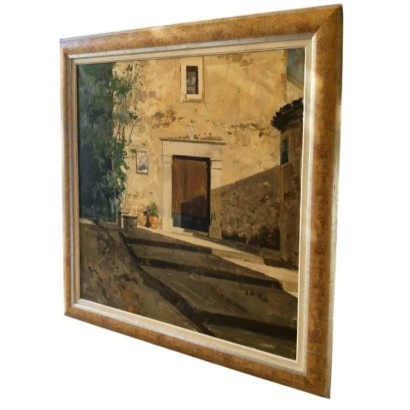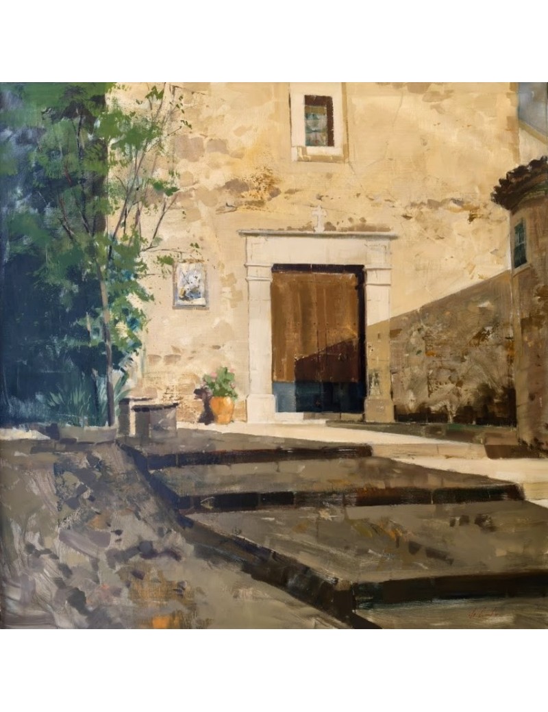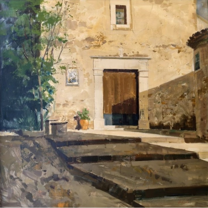 Pascual de Cabo, 90 x 90 cm, óleo sobre tela. Vista de la fachada de la iglesia de Orient (Mallorca). En primer plano, surge de la parte inferior del cuadro, la escalinata que nos acerca al portal de la Parròquia de Sant Jordi, el claro oscuro de esta escalinata con la fachada iluminada del templo, es de gran efecto y origina un efecto lumínico de gran belleza. El cuadro se cierra, por su lado izquierdo, con el verde que contrasta con la paleta predominante del beig en la totalidad del cuadro. Así consigue que la naturaleza se involucre en en paisaje.