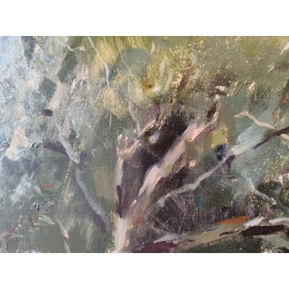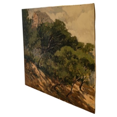 Pascual de Cabo, 90 x 90 cm, óleo sobre tela. Paraje montañoso de la Serra de Tramuntana; acapara todo el cuadro la verde arboleda de pinos que caracteriza la vegetación de estas montañas. En la parte inferior del cuadro, la luz se cuela entre las ramas, moteando de manchas de luz el terreno boscoso. En la parte superior de la composición, un pico montañoso corona el cuadro, por delante de un cielo luminoso.