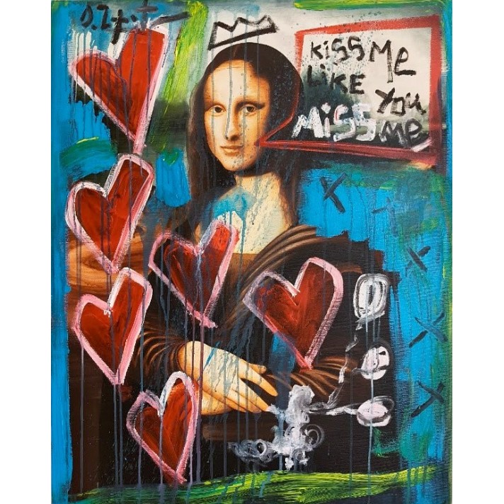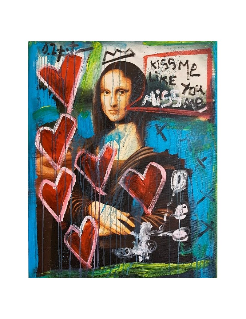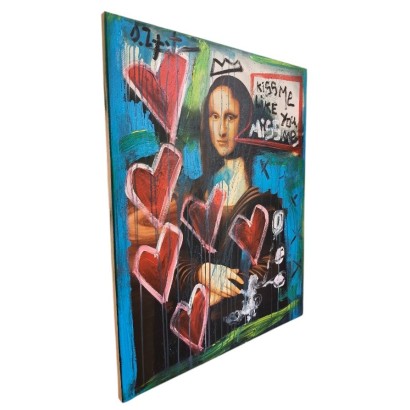 Domingo Zapata, 100 x 81, técnica mixta y acrílico sobre lienzo, 2013. Esta pintura pertenece a la serie Mona Lisa de Zapata, , una colección de piezas que presenta a la Mona Lisa de Leonardo da Vinci en varios "disfraces" y que, gran parte de ellas, se exhibieron en la Bienal de Venecia en el Palazzo da Mula. La corona y los corazones, forman parte de la simbología de Zapata.