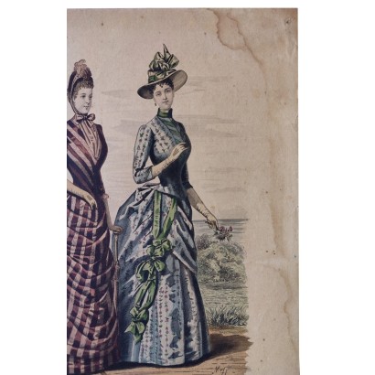 Imp. Falconer París, 32'6 x 23'5 cm, grabado a color. Dos mujeres pasean por una senda con vistas al mar. En el fondo del extremo izquierdo de la composición se aprecia la parte superior de una arquitectura, concretamente el chapitel de una iglesia gótica, mientras en el fondo del extremo derecho tras unos arbustos se asoma el mar. Las dos mujeres visten dos elegantes trajes de lo que parece ser satén, cuyos colores provocan un contraste cromático; el vestido de la mujer de la izquierda combina tonalidades rosas pastel y fucsia, mientras el derecho verdes con azul y motivos florales rosados. Ambas protagonistas llevan sombreros recargados de la época, una de ellas sostiene unas flores, mientras la otra lleva una sombrilla.