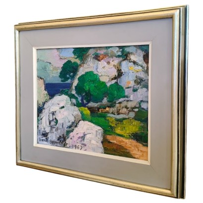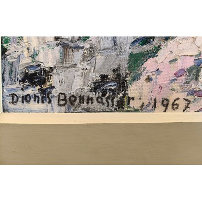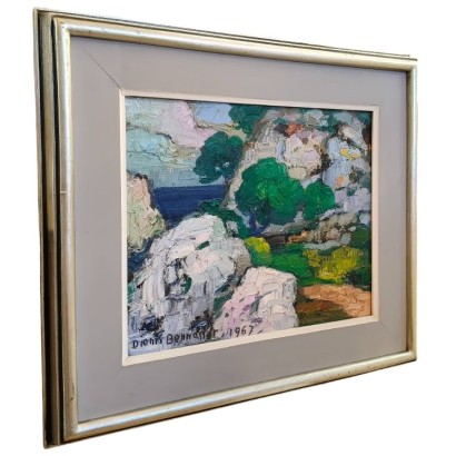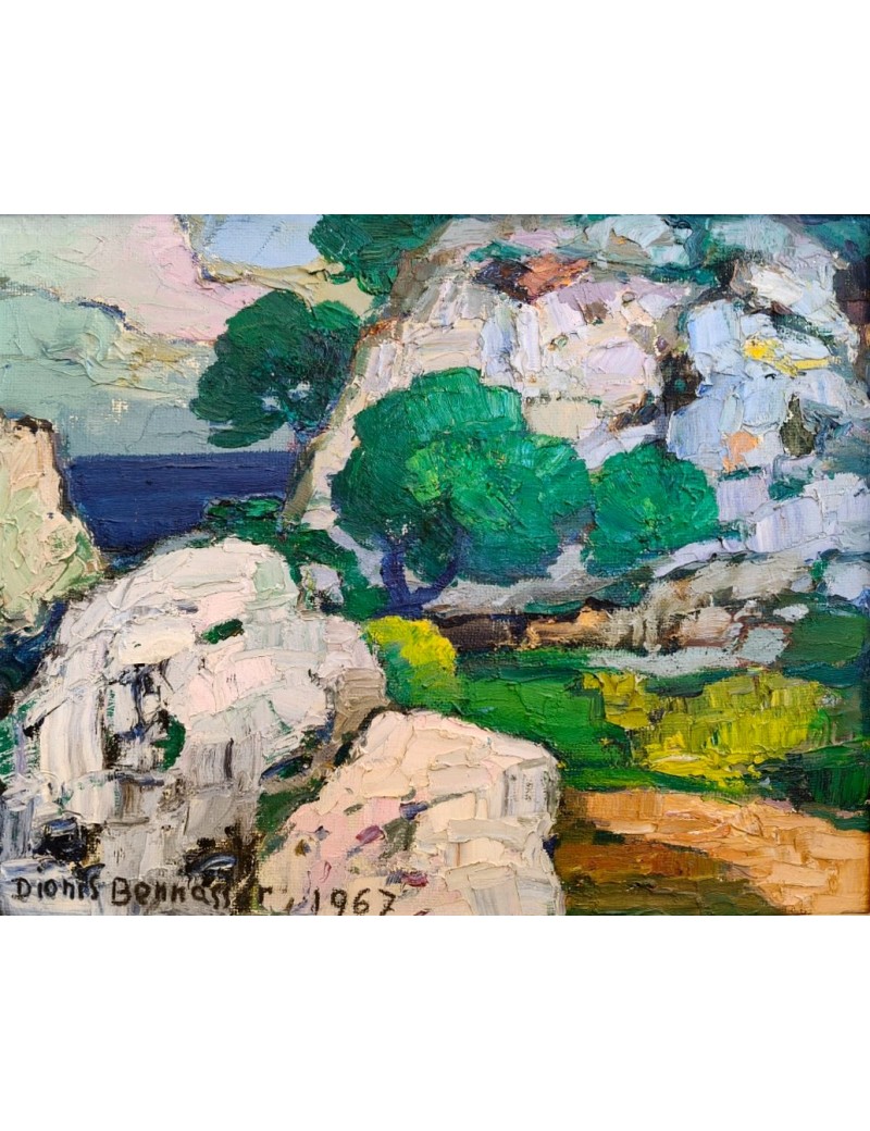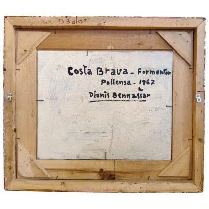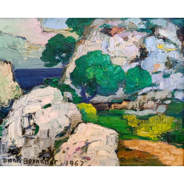 Dionís Bennàssar, 33 x 41 cm, óleo sobre tabla, 1967. Paisaje del norte de la isla, en el termino municipal de Pollença, Mallorca.  Tema costero y rocoso con los pinos como protagonistas, contrastando la verde arboleda con los grises de las rocas. El cuadro es un resultado de la asimilación de las estrategias desarrolladas a partir de los principios de la Escuela Pollensina, pintura vigorosa muy empastada, contorneado de los elementos que la componen y paleta de colores intensos y atrevidos, jugando con los rosas y violetas a la manera de Anglada Camarasa.